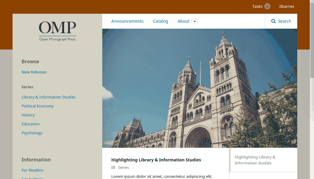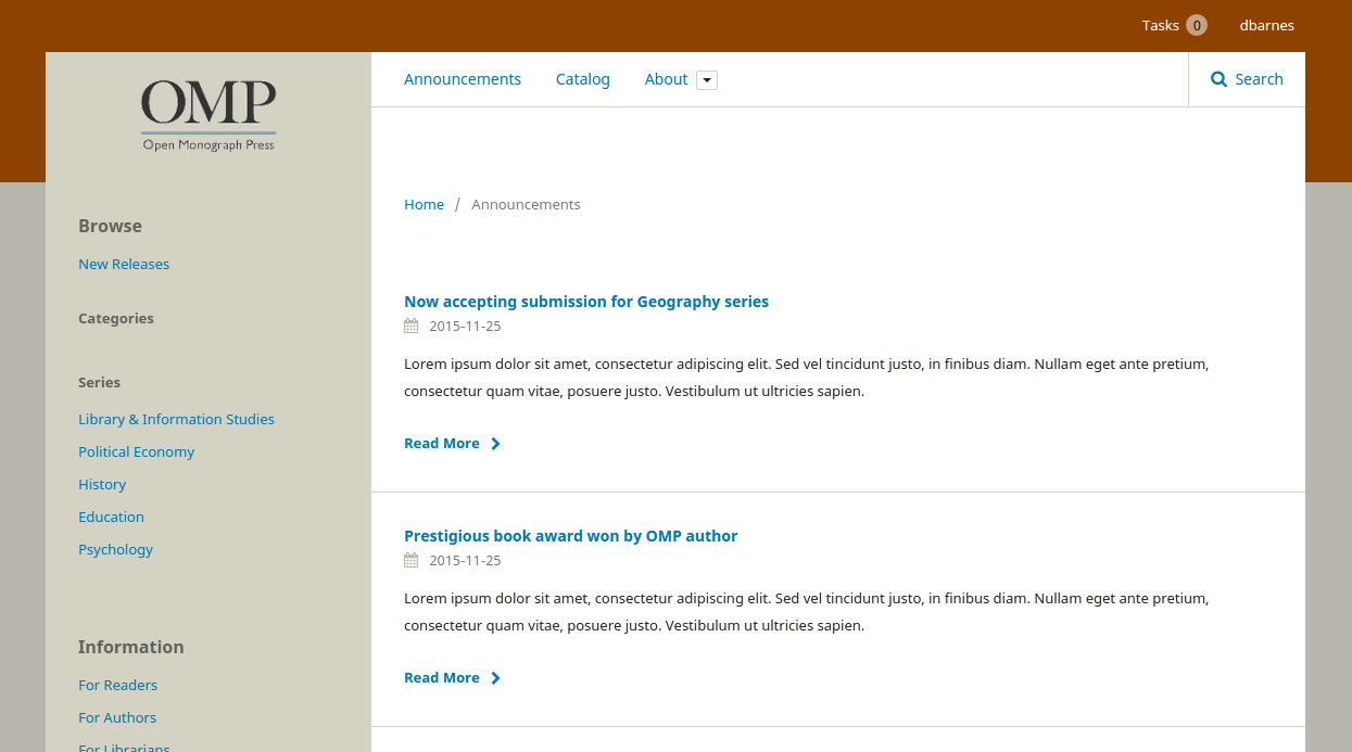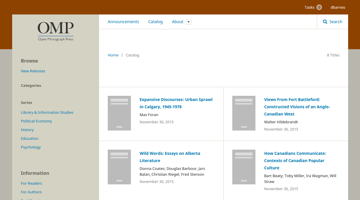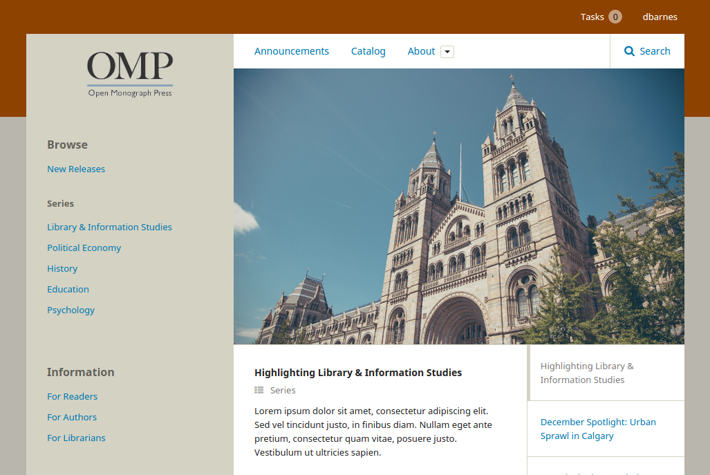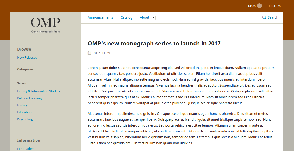 I’ll be showing you screenshots from my own test OMP installation. The OJS frontend is similar. OMP is just a bit farther along as we gear up for the OMP 1.2 release.