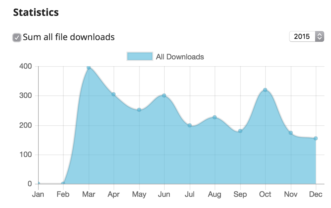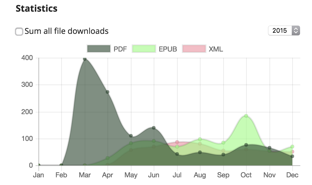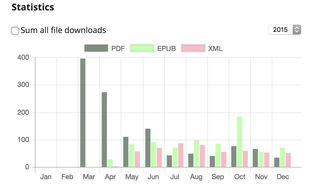 We extended the usage stats plugin with the possibility to display the usage statistics as a chart, using the JavaScript library Chart.js. The statistics are shown at the bottom of the book page, and are displayed per month for a year. The reader can chose the year, and if he/she would like to see the summarized usage statistics for the whole book or differentiated by publication formats (e.g. PDF, EPUB, HTML). In order to keep the chart and statistics readable, a restricted amount of publication formats is considered. If the number of publication formats exceeds that amount, only the summarized book statistics are shown.