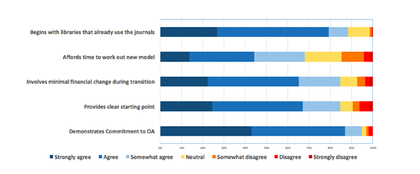 The librarian survey has to date been completed by over 270 librarians, representing over 220 institutions in 29 countries (with the majority of responses from U.S. and Canadian librarians). Through an online 10-question survey, librarians were asked to weigh in on the various risks and advantages of the SET strategy, with the overwhelming majority expressing their support for this approach. For example, when asked to consider the extent to which they agreed with reasons that the SET strategy showed promise for converting subscription journals to Open Access, librarians were overwhelmingly in agreement, as demonstrated below: