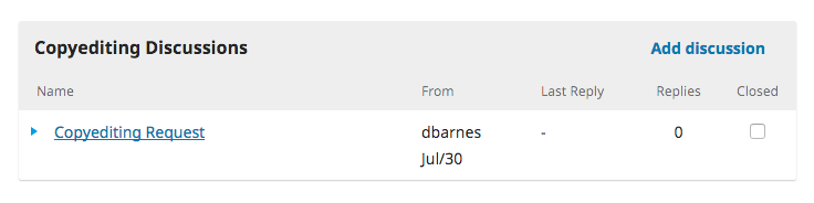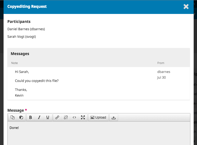 Anyone involved with the submission can be included in a discussion (the editor, section editors, authors, copyeditors, etc.). Recipients receive an email notification to inform them of the new message. Replies happen just like in a blog comment or forum post: