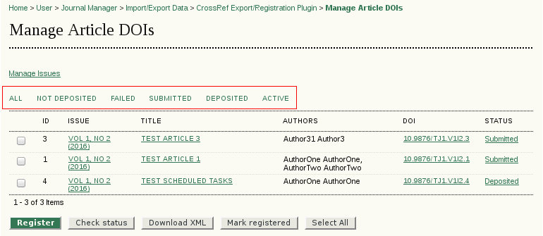 All article DOIs are listed on the main page and can be filtered by their status (all, not deposited, failed, submitted, deposited and active).
