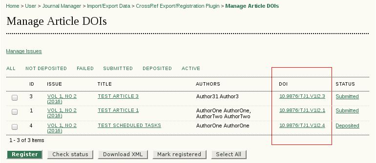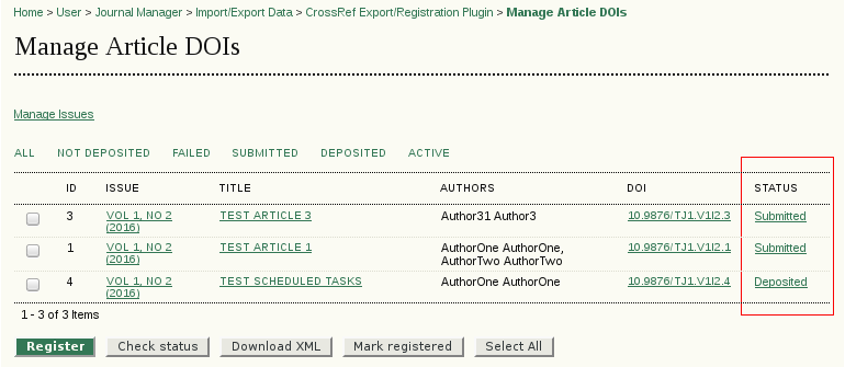 Crossref DOI registration passes through different stages: After successfully submitted (either by manually uploading the XML file in the Crossref portal or using the “Register” button in OJS) the XML document is queued for deposit. The DOI deposit could either complete successfully or fail (e.g. because a mandatory metadata is missing and the document is not valid). If successfully completed the DOI and their metadata will be activated and can be resolved using http://dx.doi.org/.