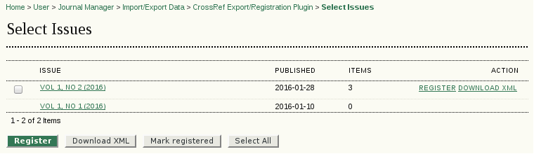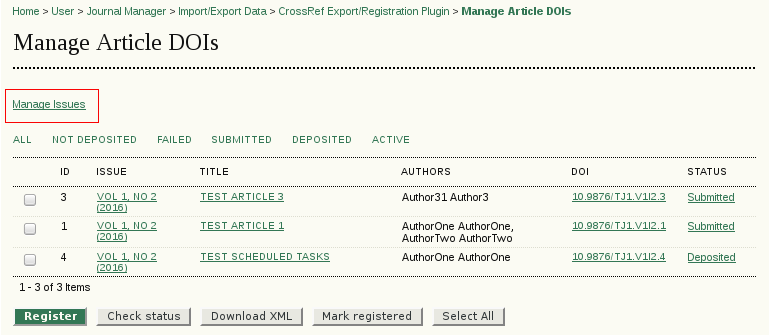 The issue managing page remained basically the same – it provides export and registration of all article DOIs of an issue. It can be reached using the link “Manage Issues” on the main article DOIs page.