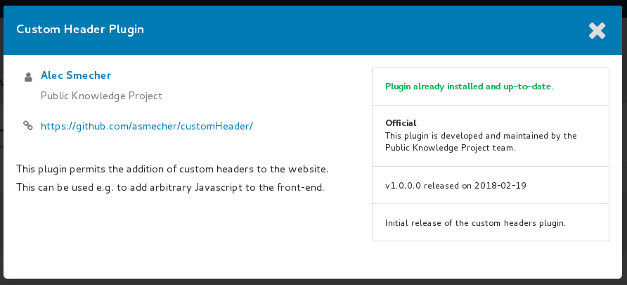Users of recent releases of OJS and OMP can install the plugin as a Site Administrator from the Plugin Gallery: