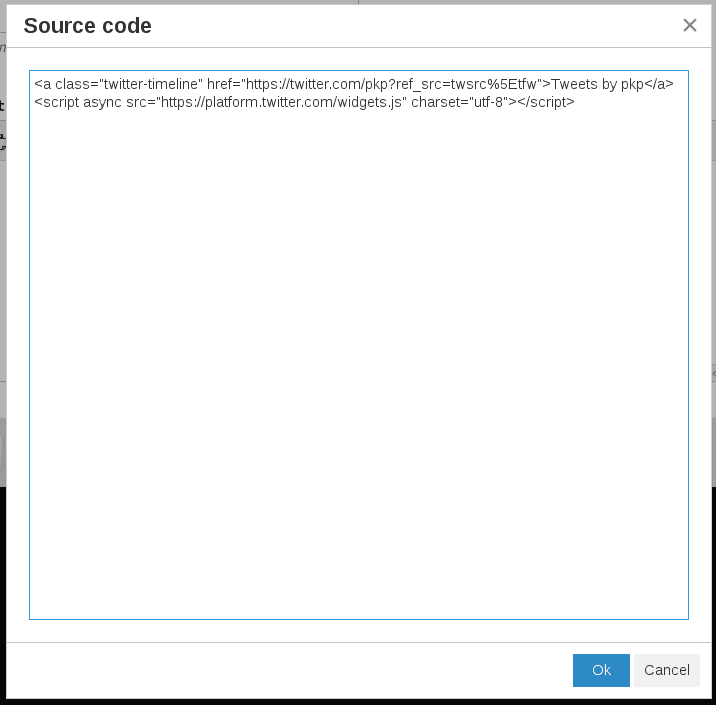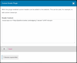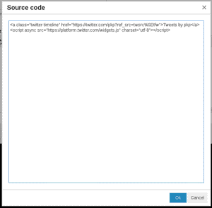 Save this in the Custom Header Plugin settings. You won’t see any visible changes, but now you can use the normal content management tools in new ways. Visit https://publish.twitter.com for an easy-to-use tool that generates markup that you can use to present timelines, Tweet buttons, etc.
