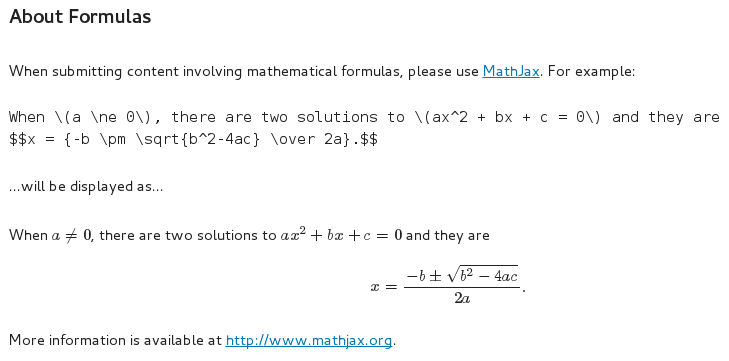 Putting this into the Custom Header Plugin’s contents setting means that MathJax formulas can be added to the journal website. (Note: if you want to use MathJax in HTML galleys, you’ll also need to make sure that the MathJax Javascript is included in your HTML, separately from the Custom Header Plugin.) For example, in a static page: