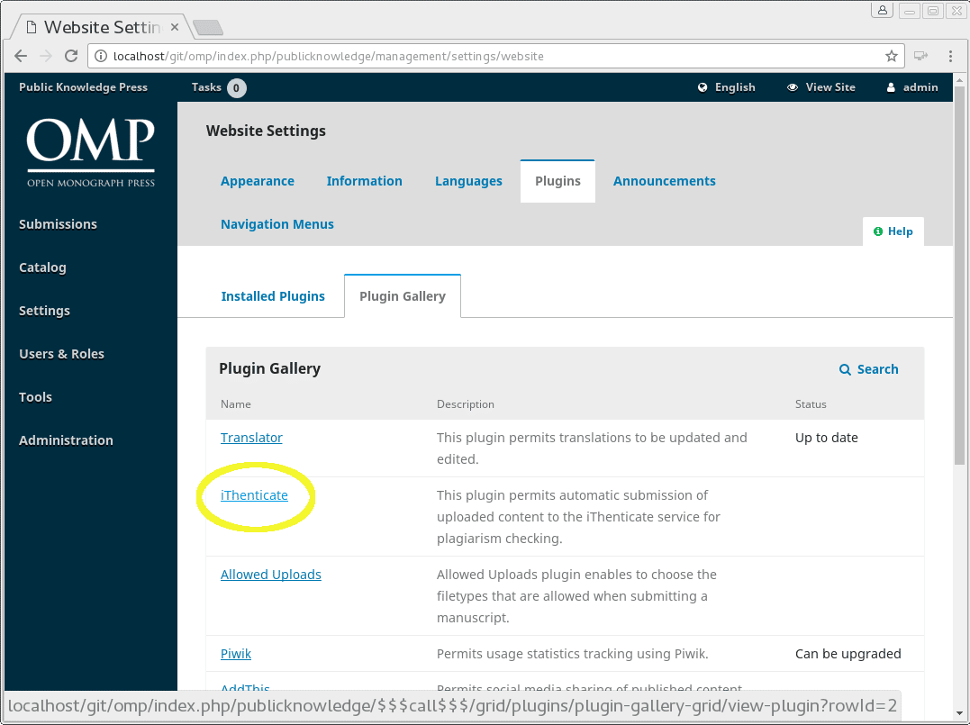 Before you can enable the plugin, you’ll need to add some configuration to your OJS or OMP config.inc.php configuration file. From the README document for the iThenticate plugin: