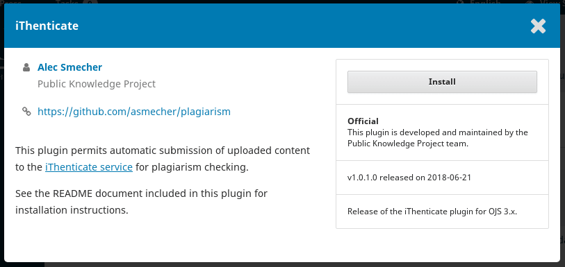 Click “iThenticate” for more information. If you’re logged in as a Site Administrator, you should have the option to Install the plugin.