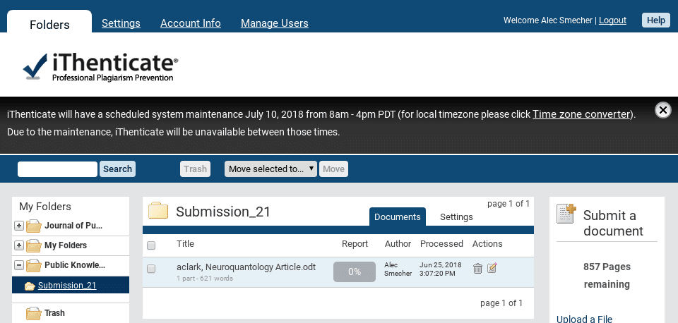 After the plugin is enabled, any new submissions to the journal will automatically be submitted to iThenticate at the end of the submission process. Each new submission will be placed into a folder along with all of its submission files.