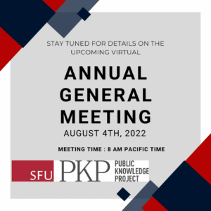 PKP is hosting the 2022 AGM and we value attendance from the community. Our software continues to improve because of the input of community members, users, software developers, editors, librarians and people in scholarly communications. Therefore, we would like to extend this invitation to you!