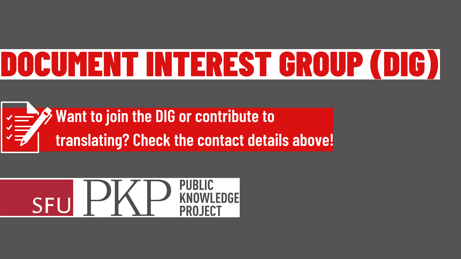It has been a long time since we last reported on the activities of PKP’s Documentation Interest Group (DIG), and we’re very excited to let you know about some of the things we’ve worked on, new and old!