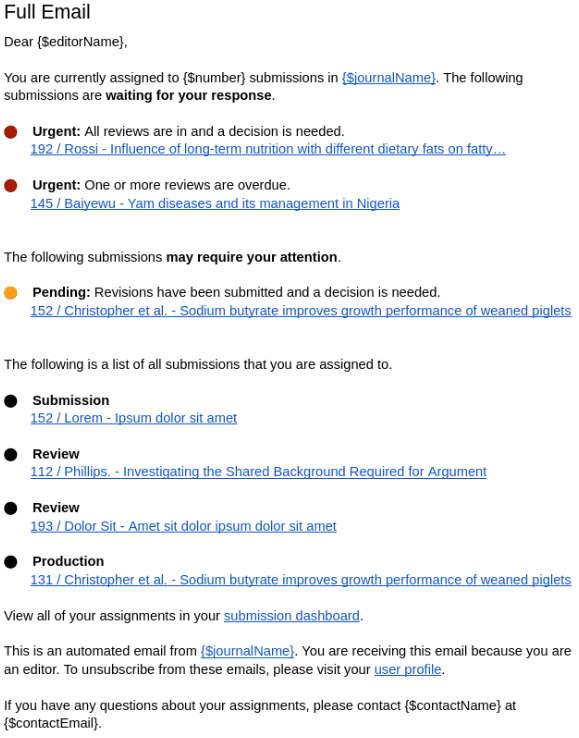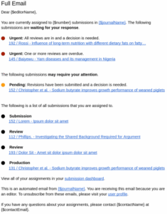 Editors are often busy and would benefit from a reminder of their assignments. Can we send them a regular email reminder showing them submissions that need their attention?