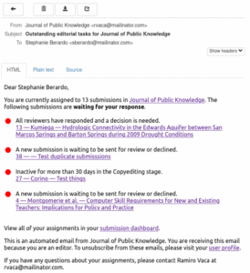 They disagreed about whether or not to include all of an editor’s assigned submissions, just like our working group. And they confirmed our suspicions that journals have very different editorial rhythms. Some will want the email weekly. Others will want it monthly. We’re not likely to find one schedule for reminders that will work for all journals and disciplines.