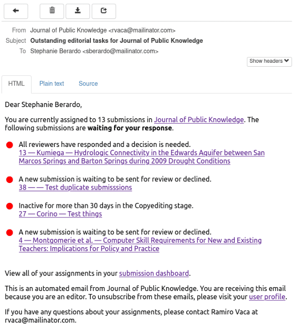 We weren’t able to implement some of the things that we discussed. The email is sent out monthly, but we think this should be configurable by each journal or editor. Currently, the email reminders don’t include any information about discussions. We wanted to include submissions where a discussion has not been replied to or closed for 30 days, but we ran out of time.