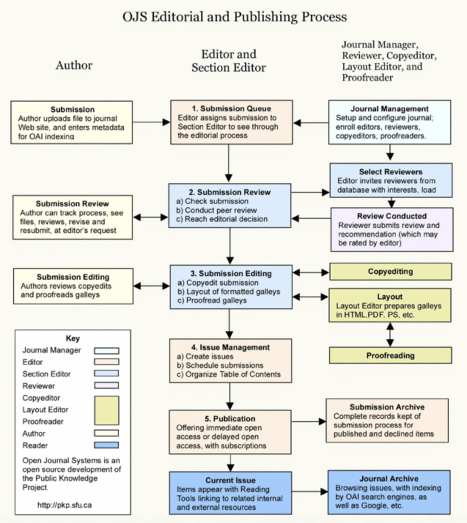 So I set out to design a publishing platform that would make it easier and cheaper for editors and publishers, as well as conference organizers, to manage, review, and distribute research online. Of course, these people had managed very little online at this point, and certainly not journals or conferences, so a warm and enthusiastic embrace was not to be expected. Still, I optimistically assumed that offering them an open-source and freely available scholarly publishing system would both help and encourage them to move in a similar direction. I returned to the blank page (and Word) to mock up stages and screens for running papers through conference and journal workflows, while drafting instructions and help for authors, reviewers, editors, and organizers (see early flowchart below). These workflows were then coded by a team of UBC undergraduates, led by Kevin Jamieson. The Public Knowledge Project released its first version of Open Conference Systems early in 2001, followed by Open Journal Systems in the spring of 2002.