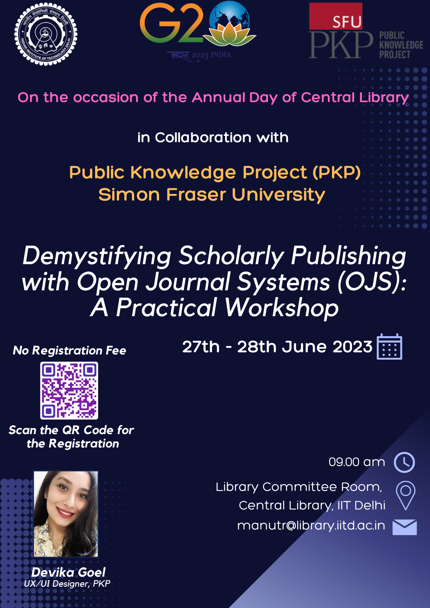 As part of PKP’s 25th Anniversary, and on the occasion of the Annual Day of the Central Library, Indian Institute of Technology (IIT) Delhi, PKP UX / UI Designer Devika Goel will offer “Demystifying Scholarly Publishing with Open Journal Systems (OJS): A Practical Workshop.”