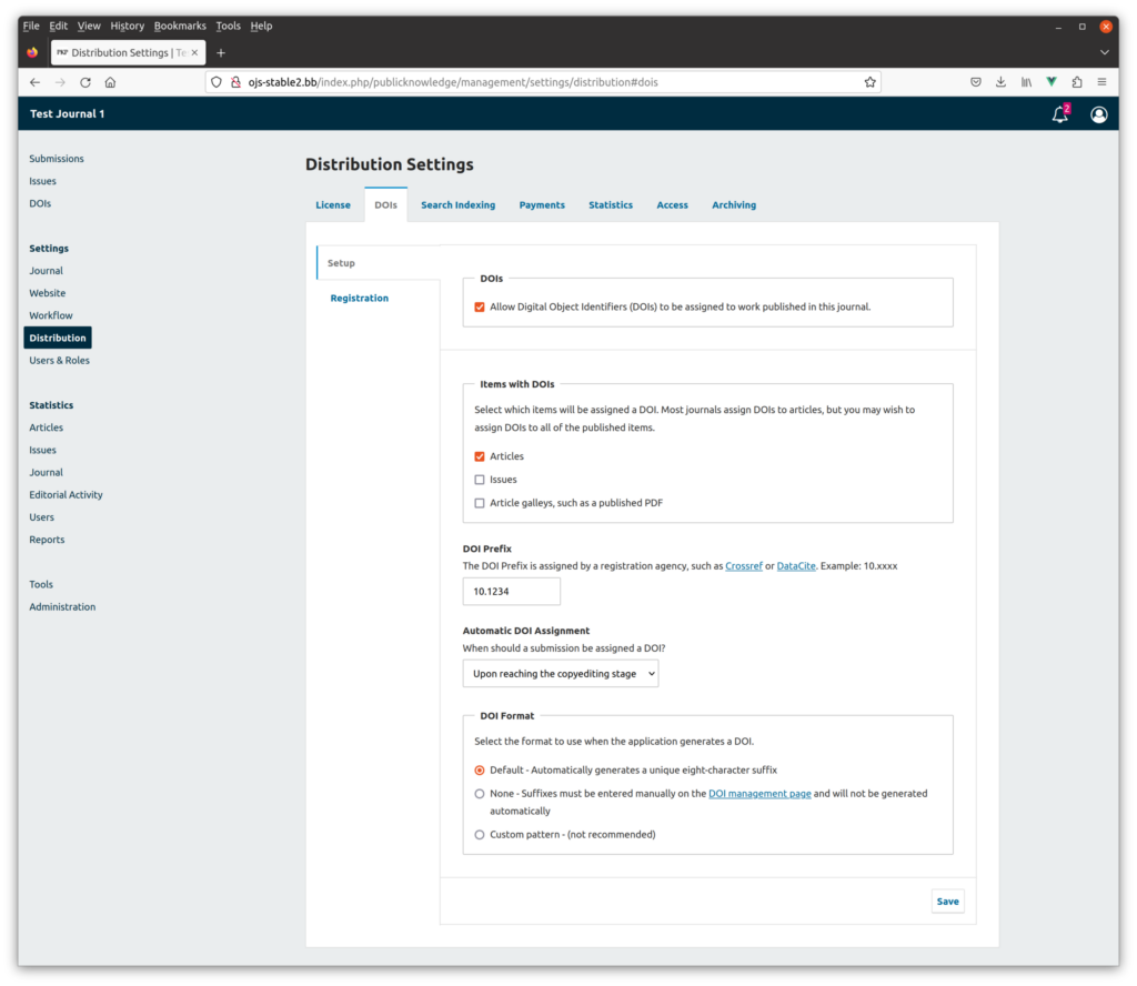 Under ‘Setup’, one can choose which types of publication items should be assigned a DOI, add a prefix, choose if the DOIs should be assigned automatically, and choose the format to use when DOIs are generated.