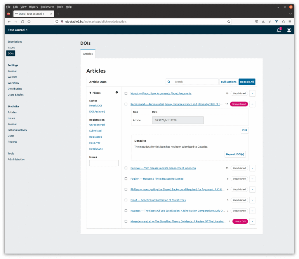 As a DataCite Registered Service Provider, PKP’s OJS software integrates with the DataCite MDS API allowing for DataCite Members and Consortium Organizations to register DOIs using their DataCite credentials.