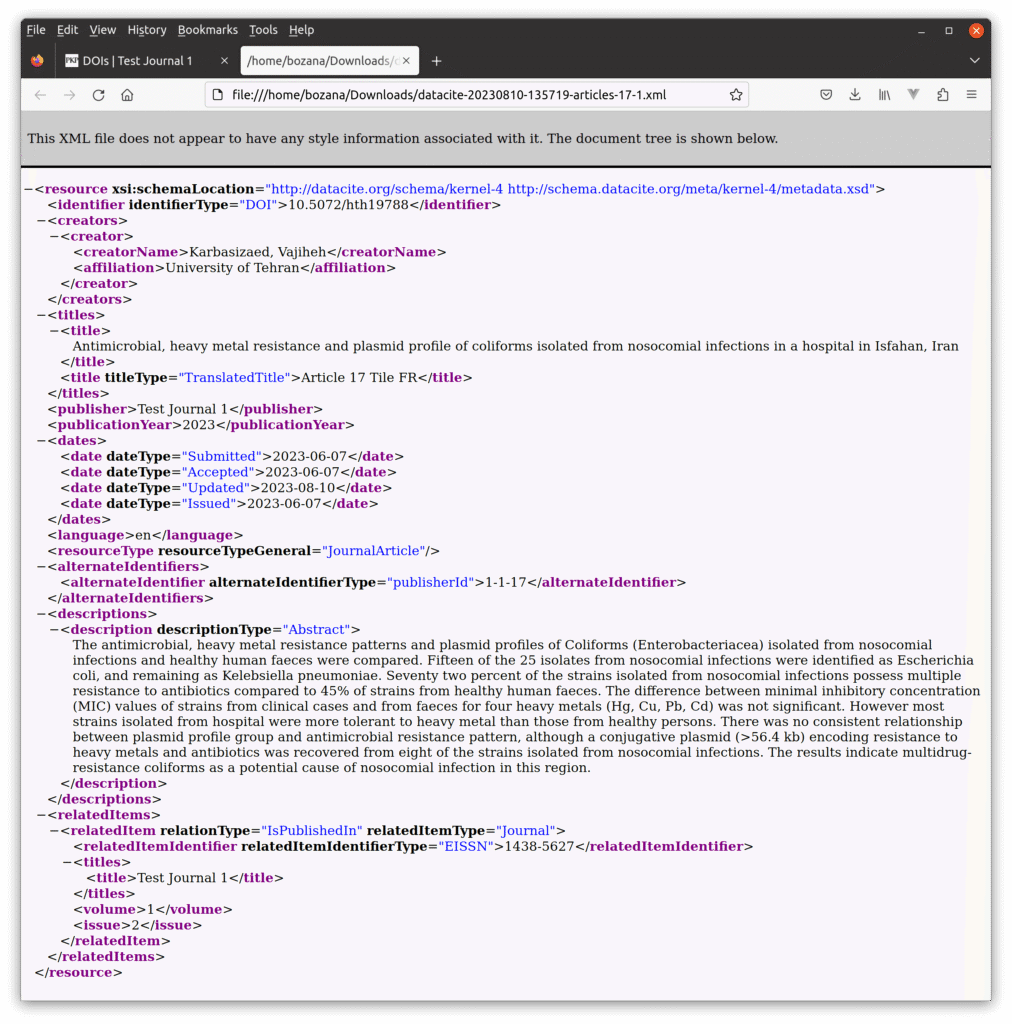 OJS supports the current DataCite Metadata Schema. Pictured below is an example of a metadata export in DataCite XML format.