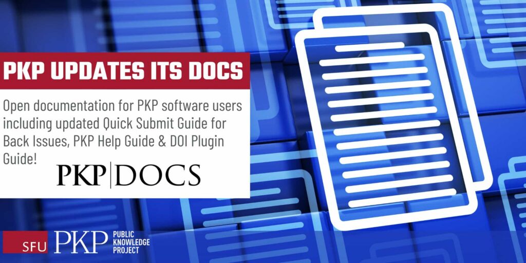 PKP shares open documentation updates for PKP software users including updated Quick Submit Guide for Back Issues, PKP Help Guide, and DOI Plugin Guide.