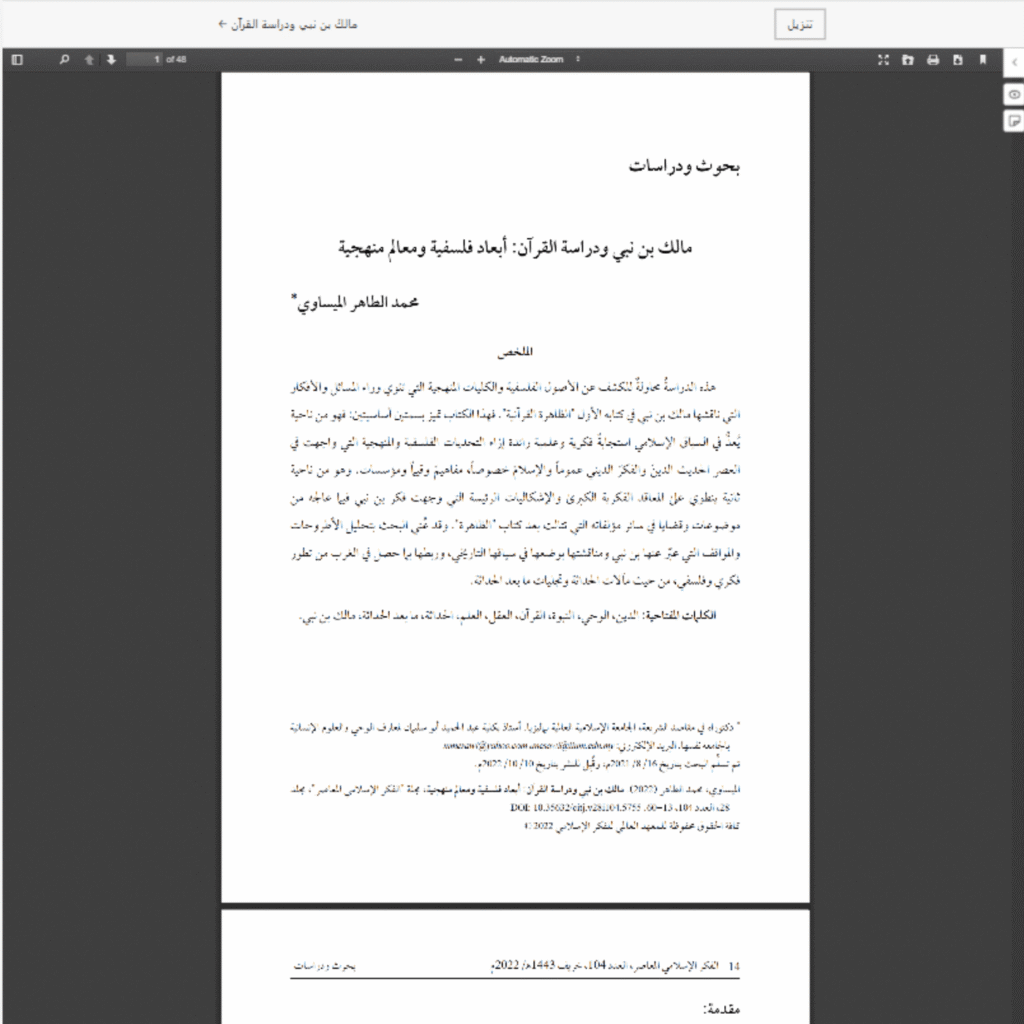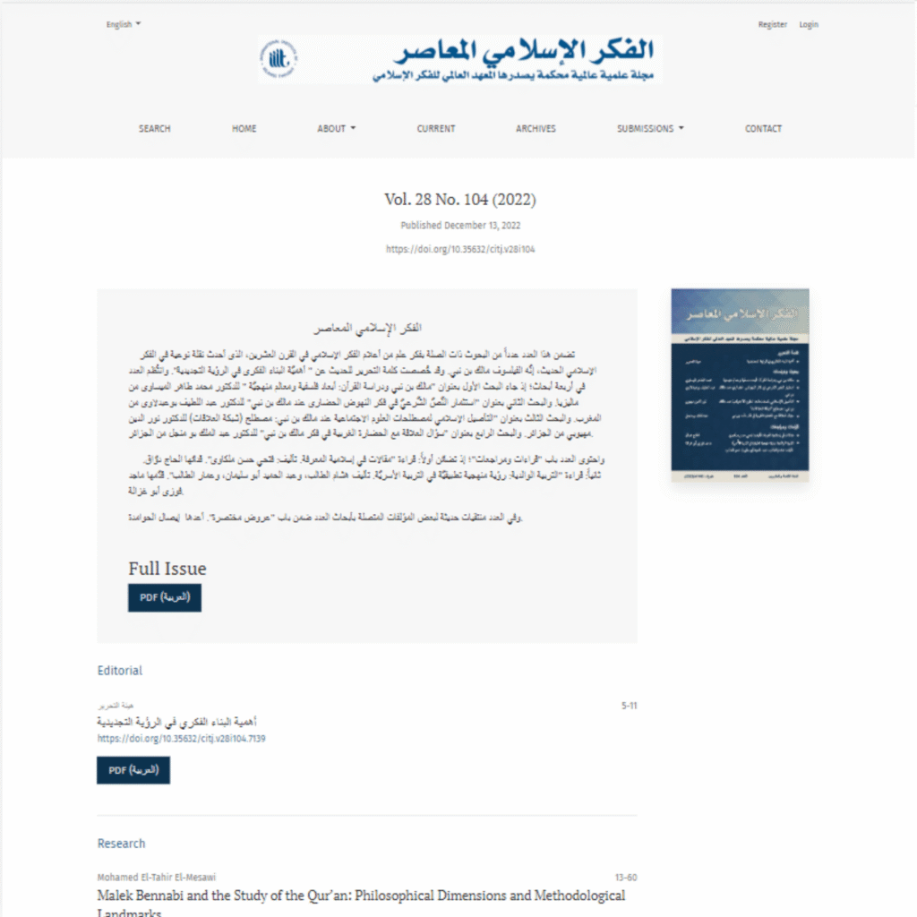 Contemporary Islamic Thought (CIT) is a scientific, international, double-blind peer-reviewed journal that aims to facilitate methodological reform in Islamic thought, promote awareness, research, and education in Muslim societies and formulate critical academic methodologies, tools, and policies that respond to the ongoing breakthroughs in human knowledge as a whole and which support and drive the revision and investment of Islamic knowledge.CIT is published twice a year by the International Institute of Islamic Thought (IIIT) in Herndon, Virginia.
