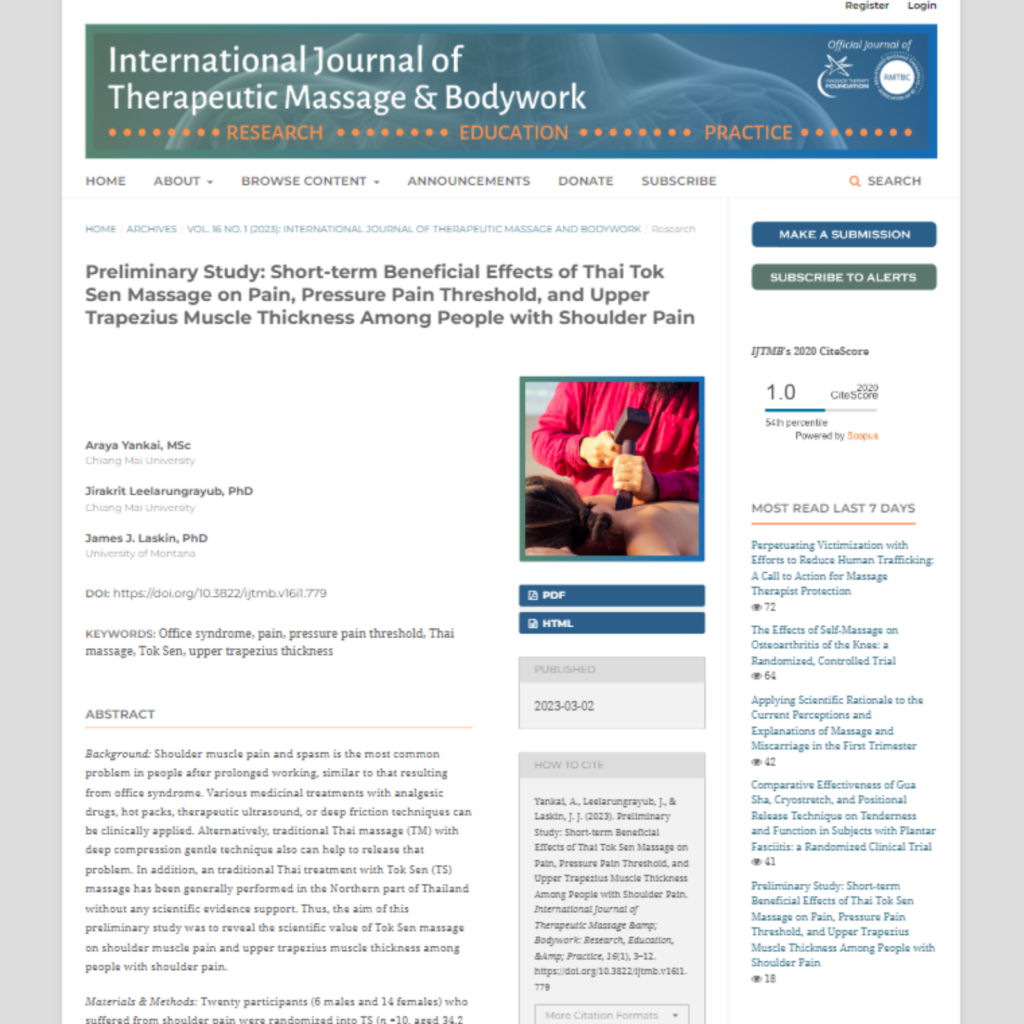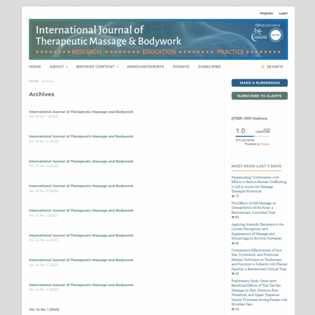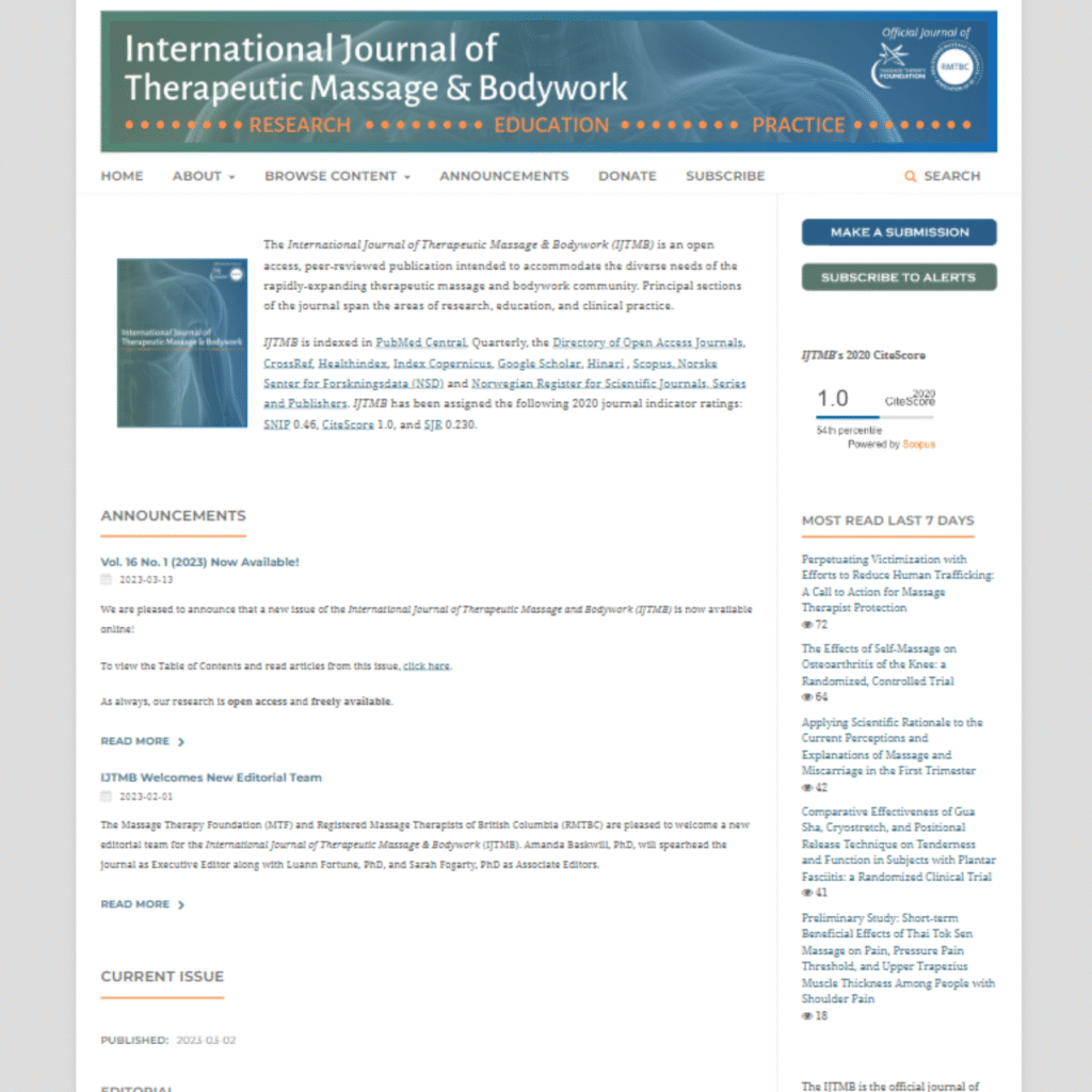 The International Journal of Therapeutic Massage and Bodywork (IJTMB) is a peer-reviewed journal focusing on the research (methodological, physiological, and clinical) and professional development of therapeutic massage and bodywork and its providers, encompassing all allied health providers whose services include manually applied therapeutic massage and bodywork. The Journal provides a professional forum for editorial input; scientifically-based articles of a research, educational, and practice-oriented nature; readers’ commentaries on journal content and related professional matters; and pertinent news and announcements.