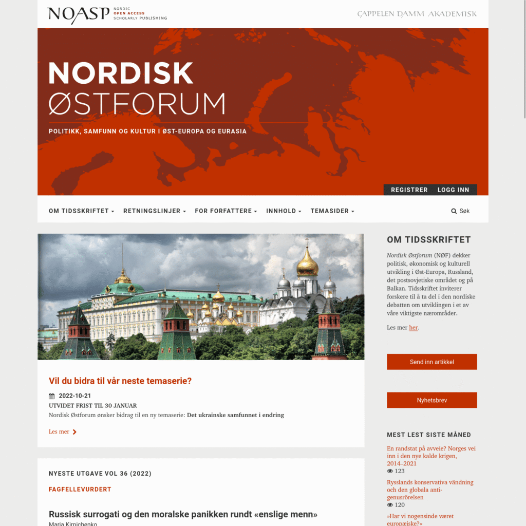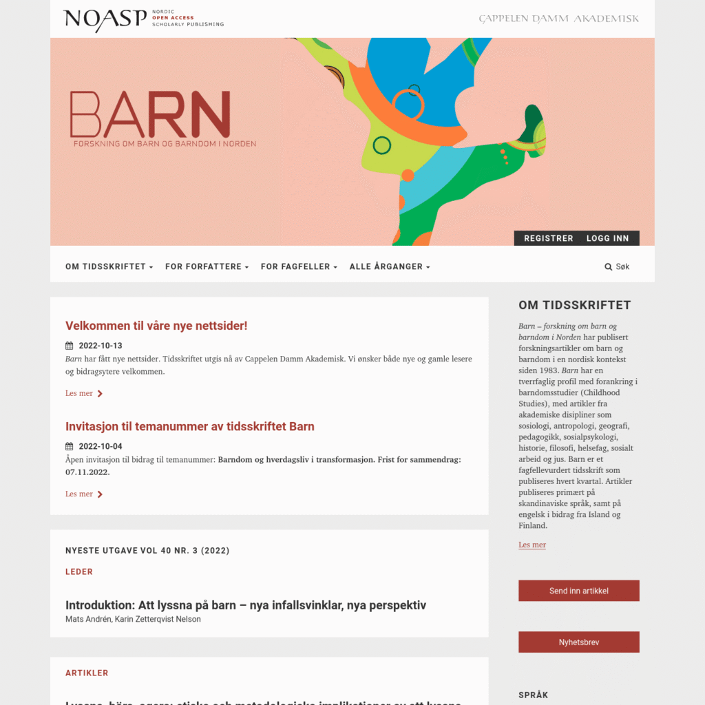 NOASP, the Open Access division of the Norwegian publisher Cappelen Damm Akademisk, uses OJS and OMP to publish more than a dozen journals and a large catalog of books. By developing a custom theme, they were able to bring their Nordic identity to the design of the journal and press: clean lines, bold colorful blocks, and an uncluttered interface for readers.